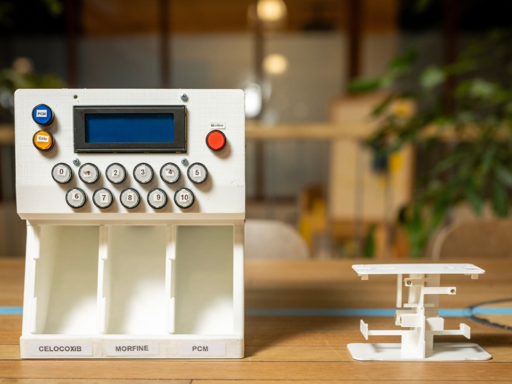 De PainSafe is ontwikkeld in samenwerking met de Universiteit Twente en Saxion. Deze slimme dispenser geeft medicatie af op basis van een pijnscore die de patiënt zelf thuis invult. Een ingebouwd algoritme bepaalt vervolgens wat nodig is. Vraagt iemand te snel opnieuw medicatie aan? Dan geeft het apparaat geen medicatie, maar volgt een instructie of melding om contact op te nemen. Zo kunnen complicaties of verslavingsrisico’s vroeg worden herkend.