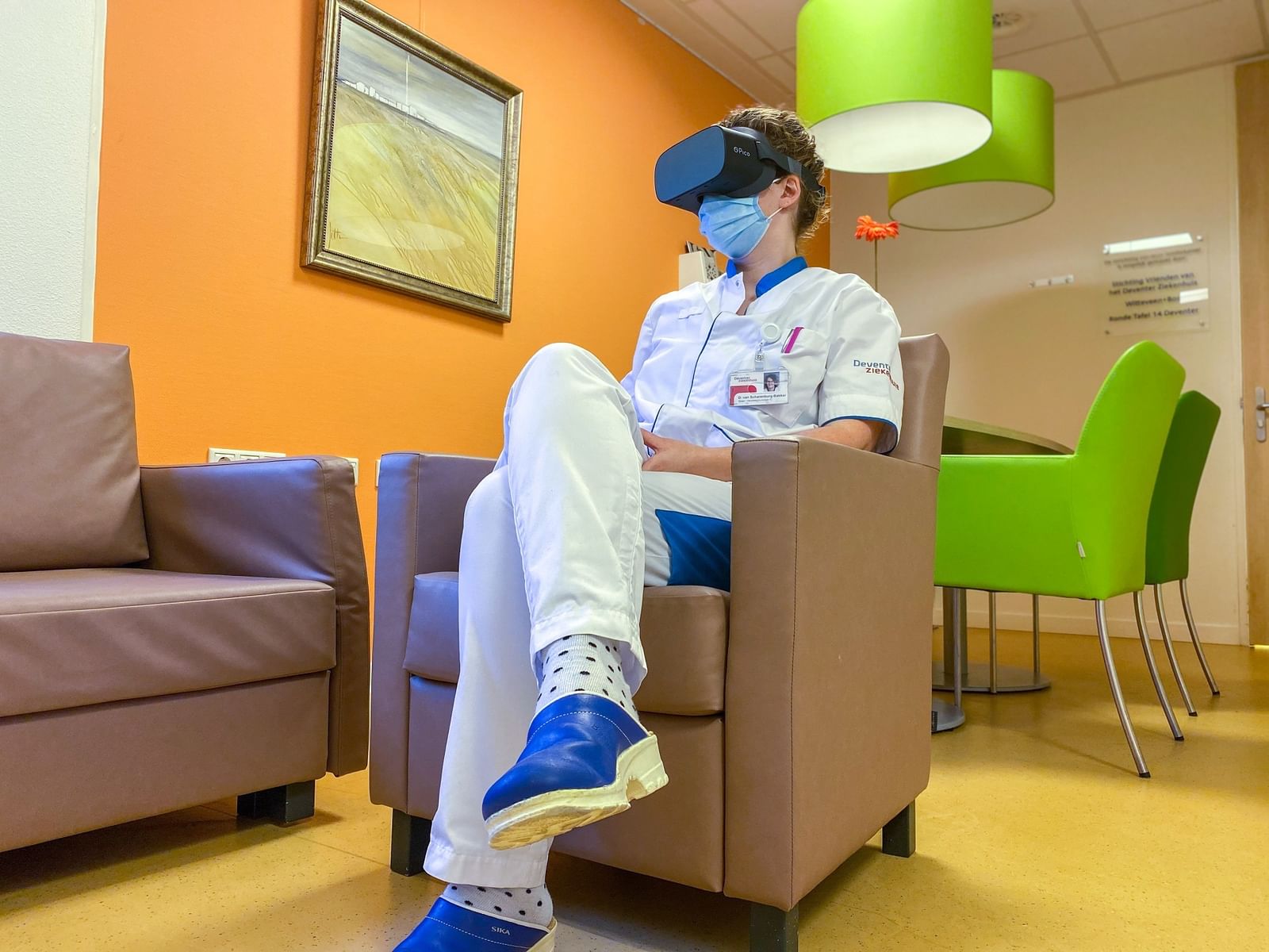 Zorgverleners op de Intensive Care kunnen zich even terugtrekken, ontspannen en tot rust komen in virtuele natuur met behulp van een VR-bril van VRelax. Verpleegkundige Daniëlle: ‘Je bent even in een totaal andere wereld. Zo kun je even je hoofd leeg maken en weer mentaal opladen.’