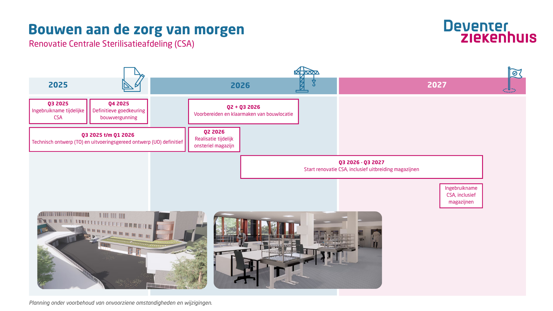 Benieuwd hoe het verloop van de renovatie van de CSA eruitziet? Bekijk de globale tijdlijn! Deze planning is onder voorbehoud, maar geeft wel een goed beeld van de verwachte stappen en mijlpalen.