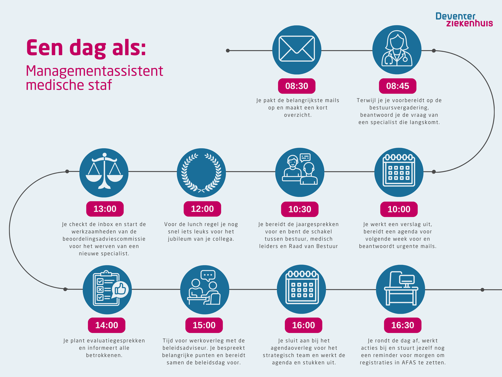 Je komt te werken binnen het geïntegreerd stafbureau van de medische staf van het Deventer Ziekenhuis. Dit bureau ondersteunt ook de maatschap van vrijgevestigde specialisten in het ziekenhuis. Het bestuur van de medische staf is de strategisch partner van de Raad van Bestuur. Samen zetten zij de lijnen uit voor beleidsontwikkeling, medische kwaliteit en organisatie van zorg. Binnen het geïntegreerd stafbureau werk je samen met vijf betrokken collega’s. De lijnen zijn kort, de samenwerking is intensief en er is veel ruimte voor eigen initiatief en professionele inbreng.